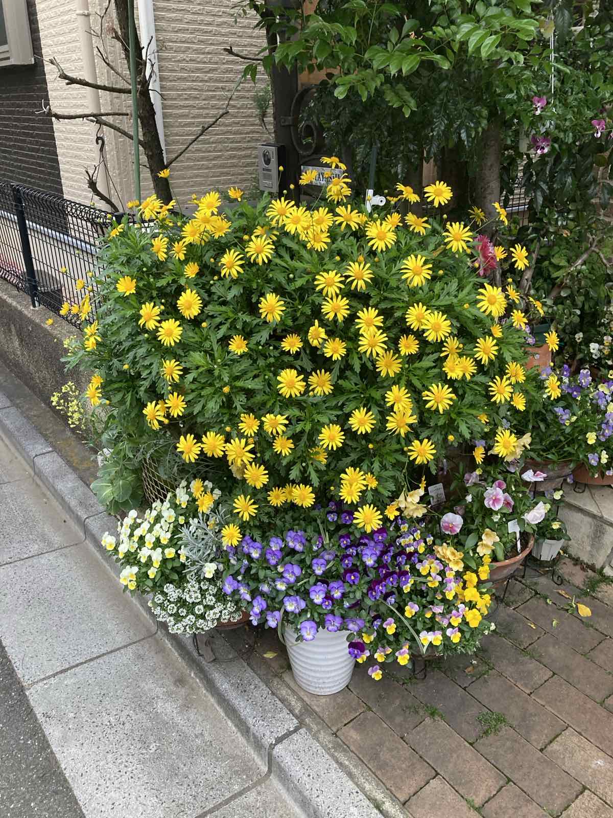 もともとあったパンジーやビオラが、巨大化したマーガレットに優しく(?)包み込まれ、もはや飲み込まれそうな勢いです。